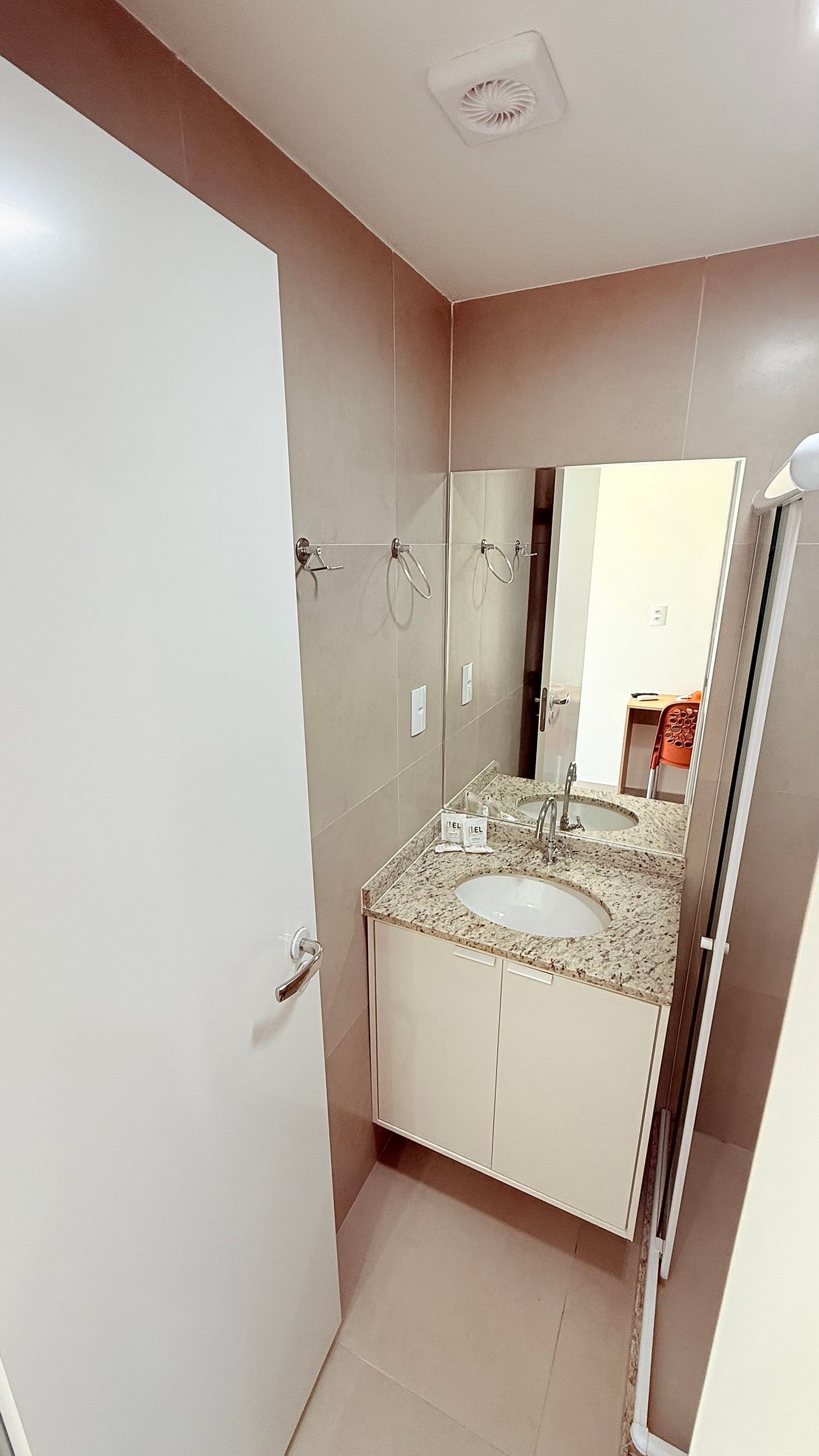 The modern kitchen is fully functional, equipped with a refrigerator, microwave, cooktop, coffee maker, and essential utensils — ideal for preparing breakfast or a quick meal. The bathroom features granite finishes, a refreshing shower, and thoughtful details for added comfort.
