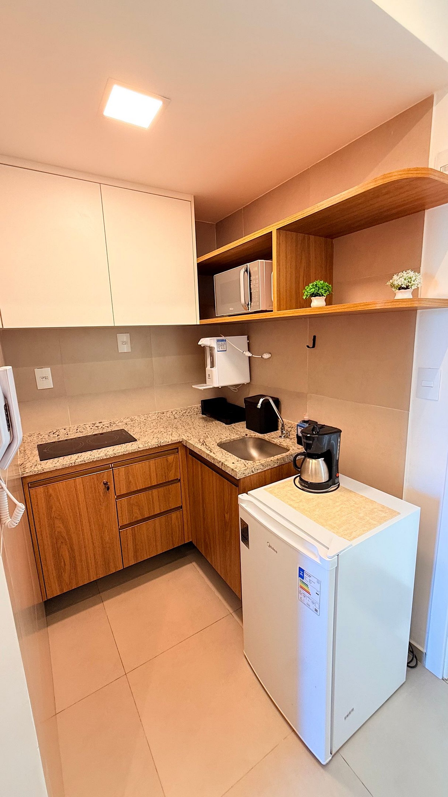 Contemporary decor, a comfortable bed, air conditioning, a fully equipped kitchen, and a private balcony create a welcoming and practical environment, allowing guests to feel at home. Every detail has been thoughtfully planned to ensure comfort, organization, and peace throughout the stay.