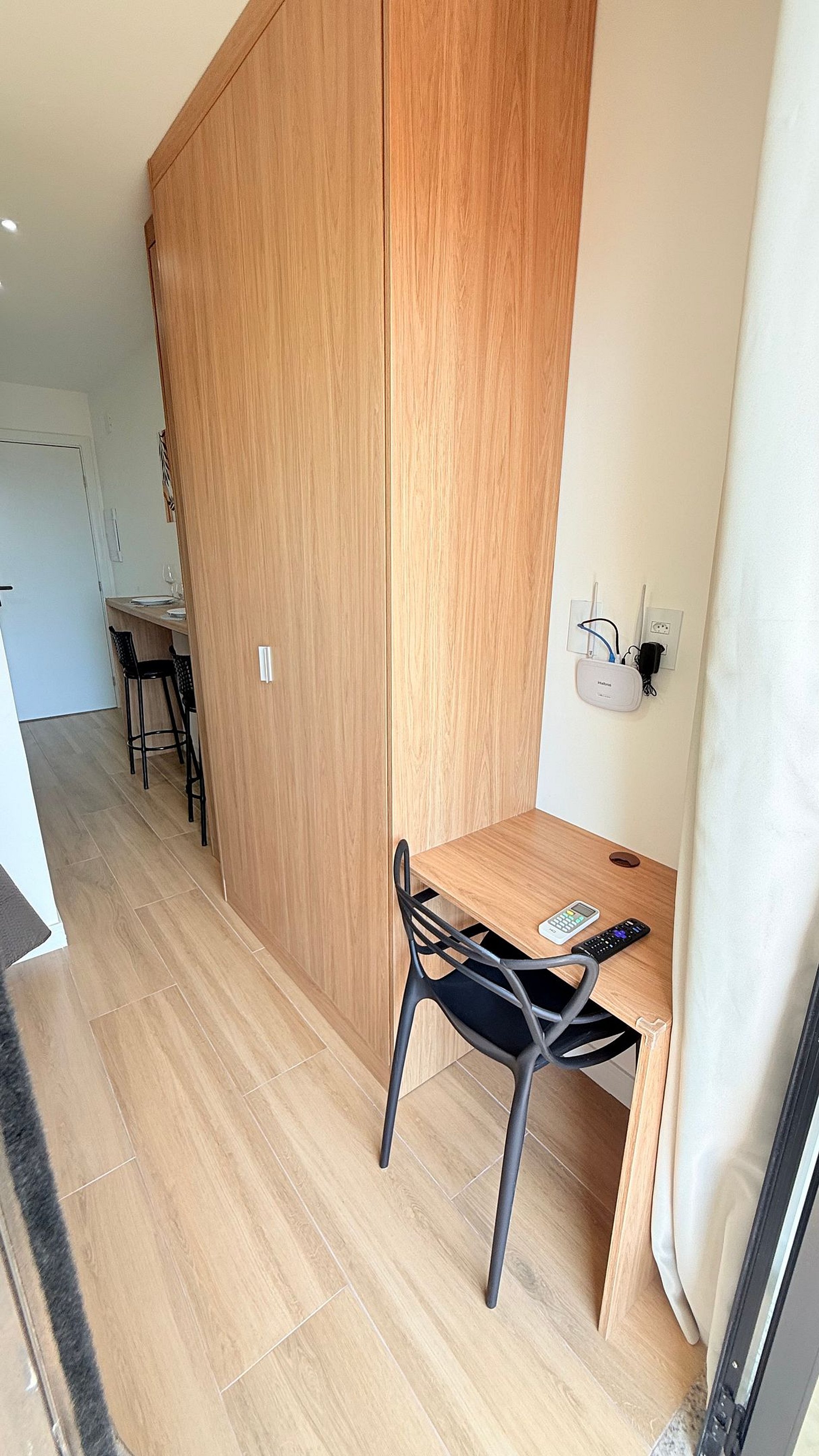 En la zona de estar y descanso, el mobiliario a medida optimiza cada metro cuadrado: escritorio amplio ideal para home office, TV moderna en panel de madera con decoración elegante y un toque natural con plantas. La cama es amplia y cómoda, con ropa de cama estilo hotel, edredones suaves y almohadas cuidadosamente seleccionadas para garantizar noches de descanso perfectas.