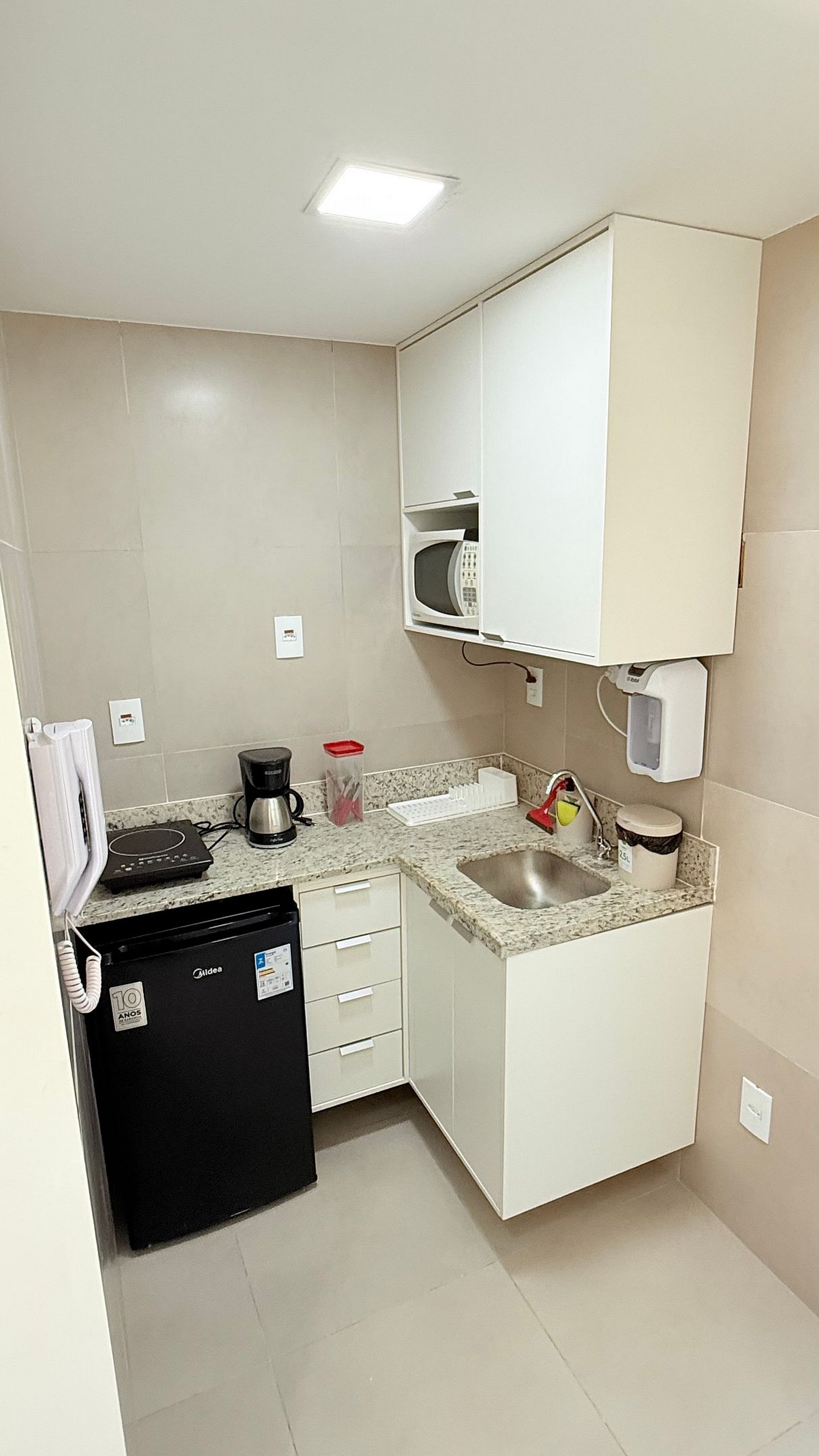 La cocina es moderna y funcional, equipada con frigobar, microondas, cooktop, cafetera y utensilios esenciales — perfecta para preparar un desayuno o una comida rápida. El baño cuenta con acabados en granito, ducha relajante y detalles que garantizan practicidad y comodidad.