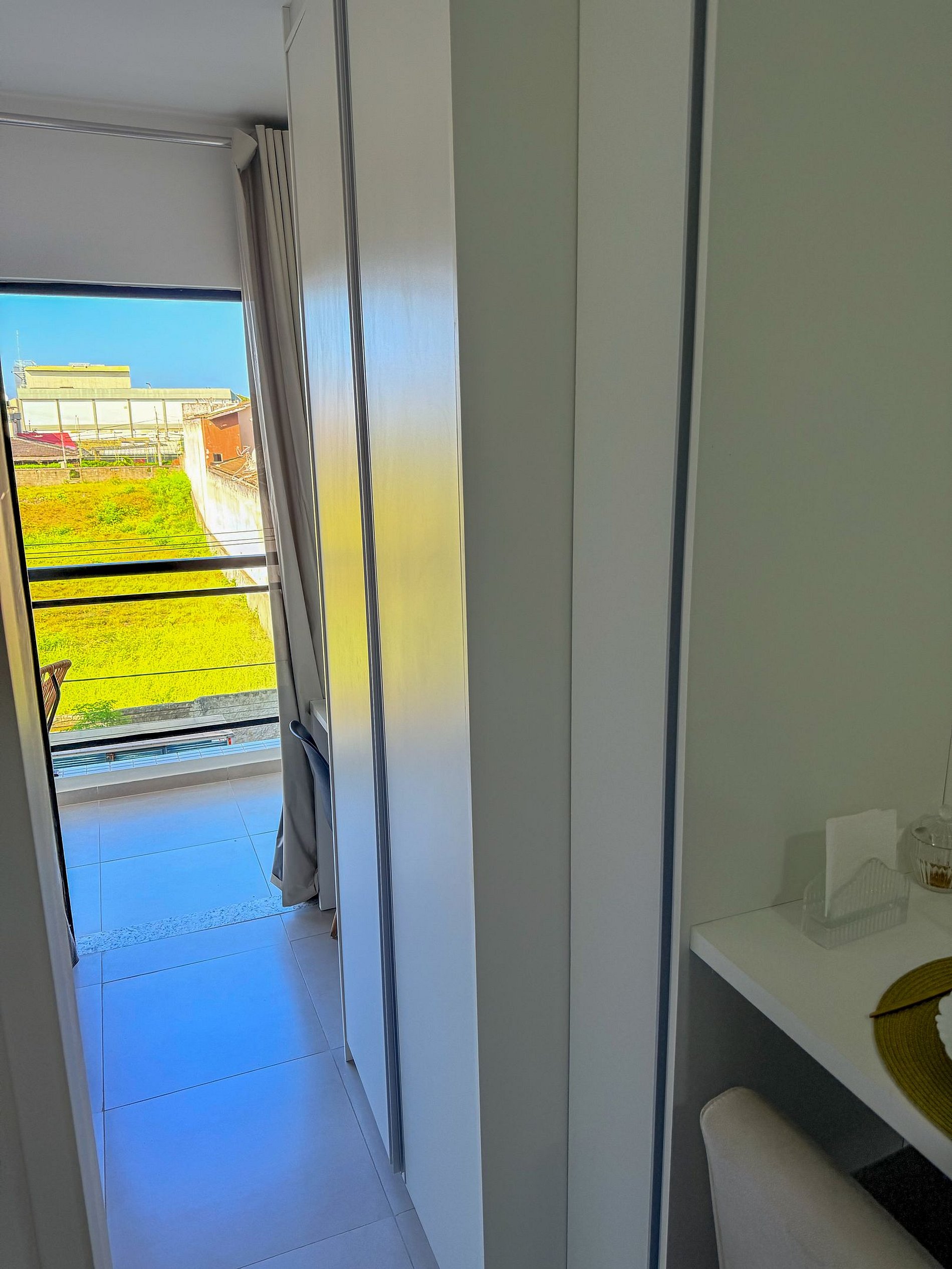 O espaço foi decorado com tons neutros e iluminação suave, criando uma atmosfera acolhedora e relaxante. A varanda é um convite para momentos de descanso, enquanto o espaço de trabalho integrado permite que o hóspede se mantenha produtivo, com internet de alta velocidade e ambiente silencioso.